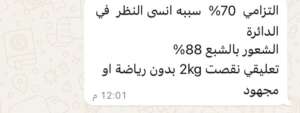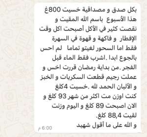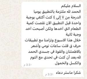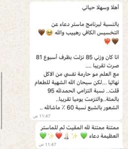 الحمدلله رب العالمين ملتزمة وأشعر بالشبع لمدة طويلة مع أخد اعشاب طبيعيه للتخسيس وأشعر أني نازلة بالوزن شكرا ماستر دعاء